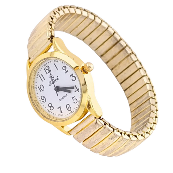 Жіночий стильний наручний годинник STYLE/Xwei з кварцовим механізмом. Круглий корпус жовтого кольору діаметром 28 мм. Білий циферблат з арабськими цифрами. Класичний стрілочний дизайн. Годинник в комплекті з металевим браслетом жовтого кольору, що розтягується, шириною 14 мм. Браслет на гумці відрізняється своєю гнучкістю та простотою у використанні, утворює дуже зручну та надійну посадку на зап'ястя.