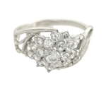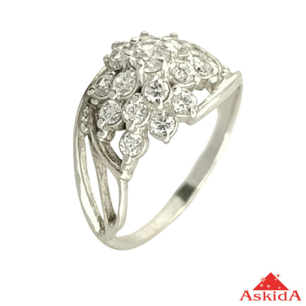 Жіноча каблучка з фіанітами виготовлена зі срібла 925 проби. Верхівка кільця прикрашена безліччю фіанітів, у центрі яких височить більший діаметром 3 мм, закріплений шістьма крапанами. Обідок кільця має оригінальну неповторну форму і благородний блиск, що підкреслює природну красу фіанітів. Ширина кільця 2 мм, розширення 9 мм, середня вага 1,81 гр.